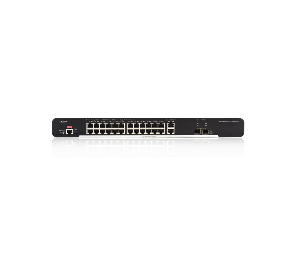 Thiết bị chuyển mạch switch Ruijie XS-S1920-26GT2SFP-P-E là thiết bị chuyển mạch lớp 2 được quản lý thông minh hiệu quả chi phí thế hệ tiếp theo cho bất động sản thương mại, khách sạn và camera quan sát.